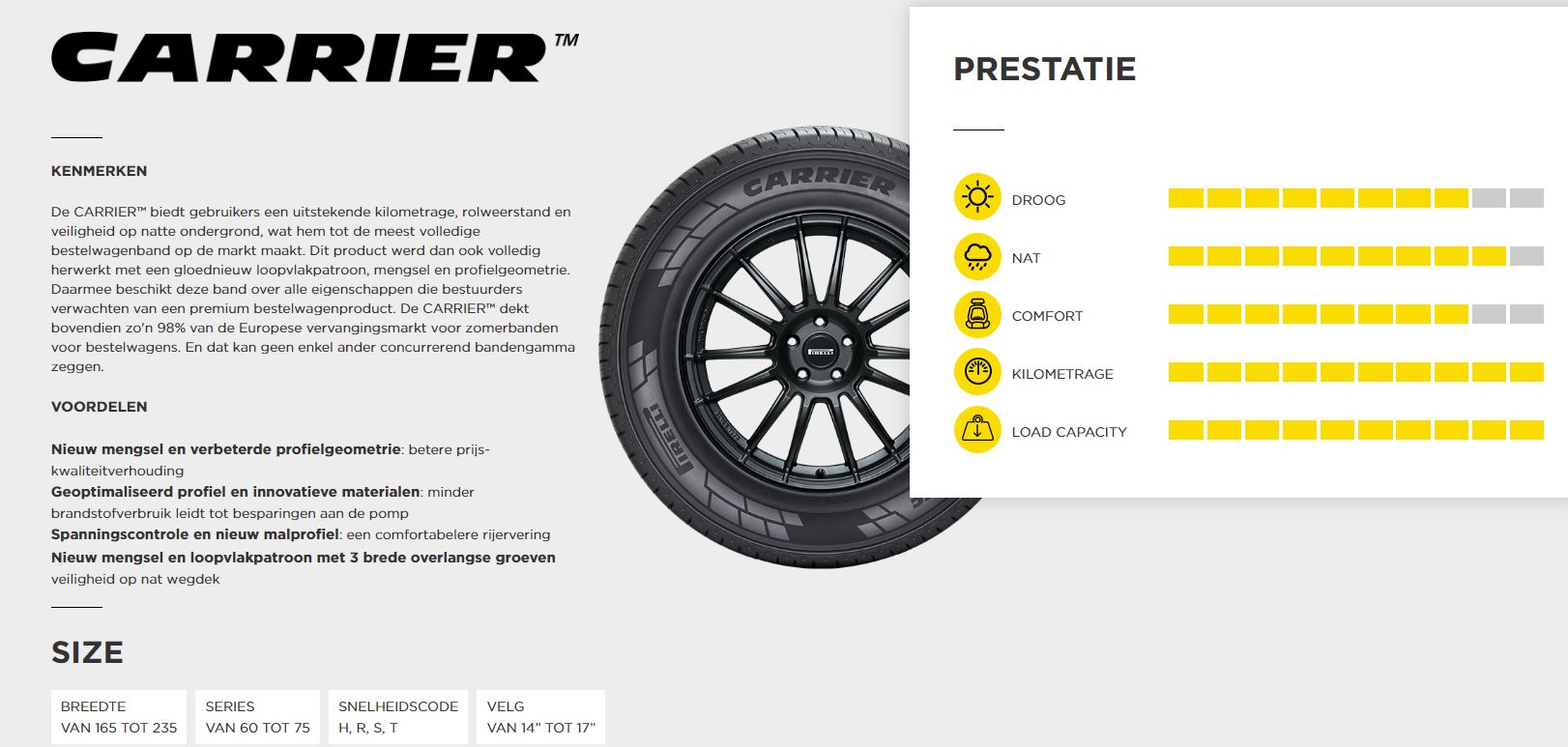 Het merk is PIRELLI, een Premiummerk. Het type profiel van de band is Carrier.